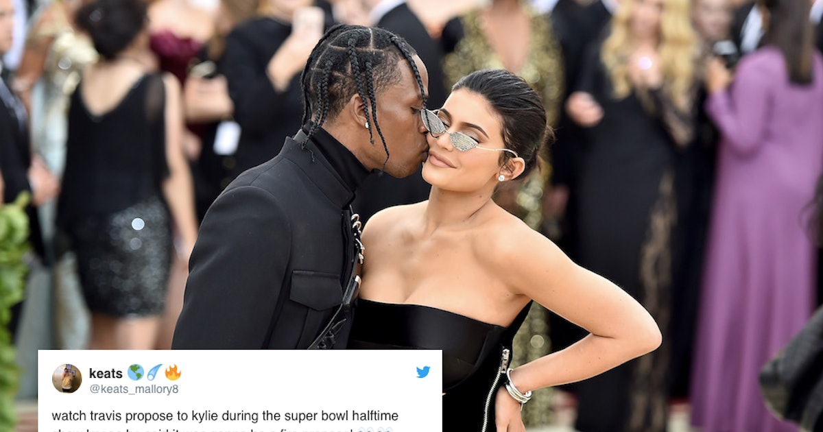 And now that fans are putting two and two together, they have seemingly come to a staggering realization that there is, at the very least, a remote possibility that Travis Scott will propose to Kylie Jenner at the Super Bowl. While it might be slightly outlandish, considering the couple's very private persona, he did say that he wanted to propose in a "fire" way, and what way is more "fire" than at the damn Super Bowl halftime show?